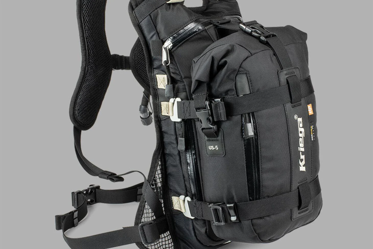 • Se engancha a la mayoría de las mochilas Kriega* para obtener almacenamiento adicional a prueba de agua. *excluyendo Max28, Hydro-2
