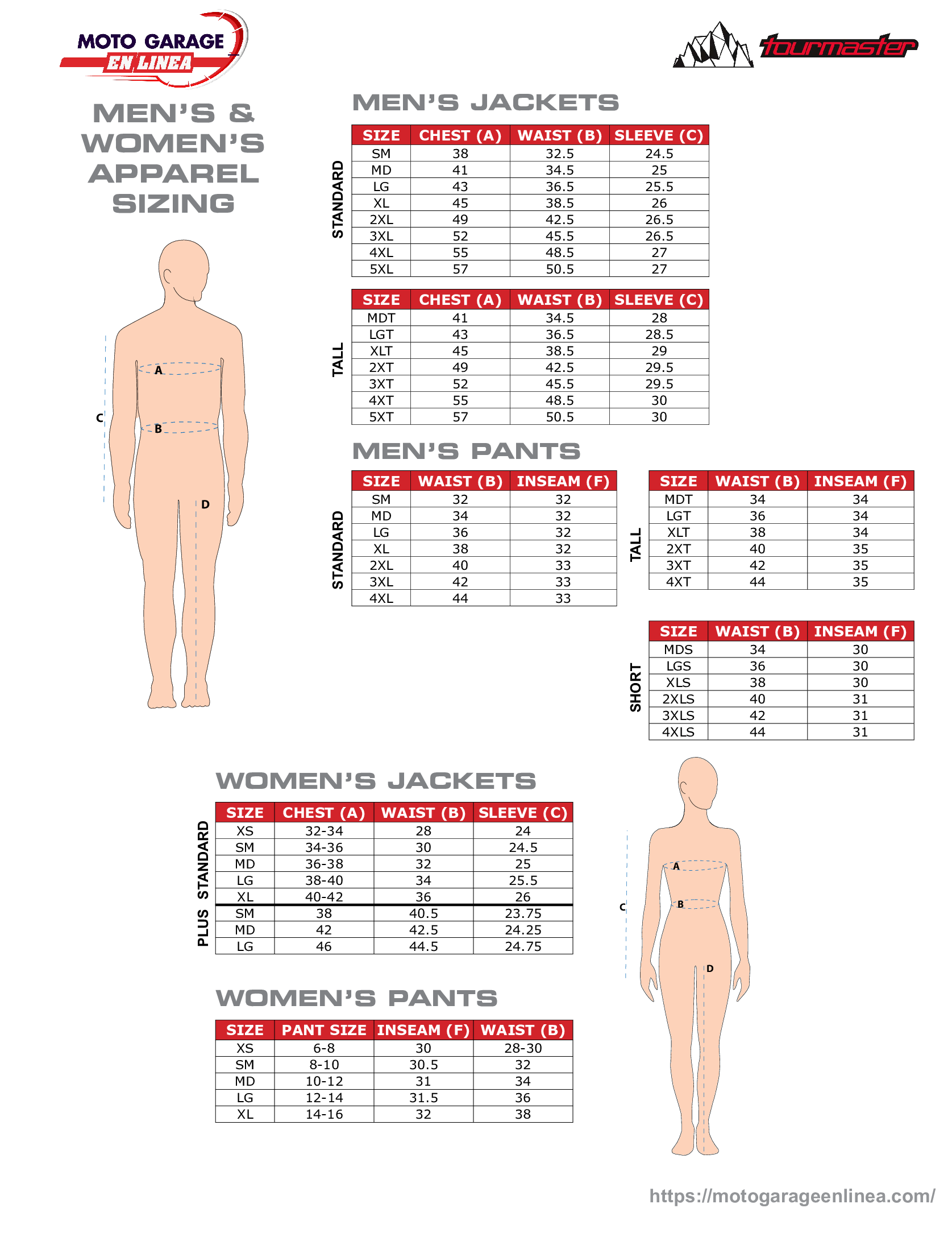 Size: Tamaño, Chest: Pecho, Waist: Cintura, Sleeve: Manga, (in): Pulgadas